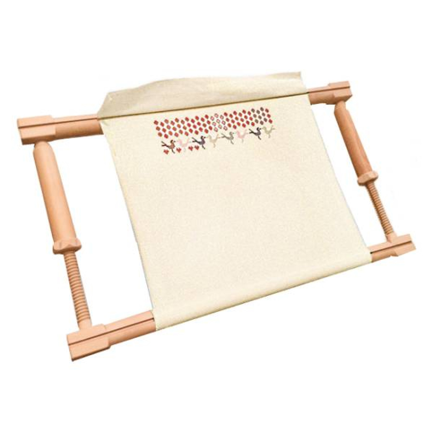 Seu sistema de braços com rosca ajustável nas laterais permite regular a tensão do tecido sem a necessidade de amarrações, mantendo o trabalho firme do início ao fim.